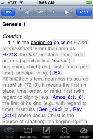 Tapping on any underlined word opens up the strongs definition for that word. Here, we've tapped on the word "beginning".
